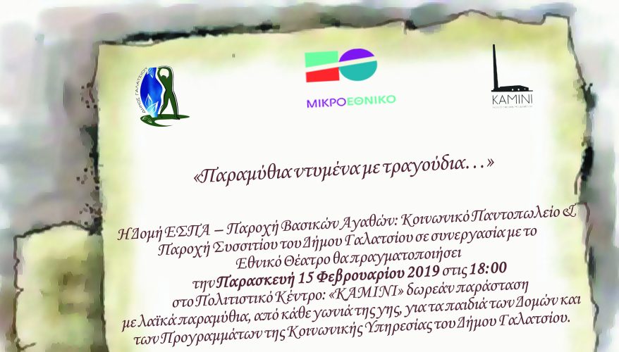 Η Δομή ΕΣΠΑ – Παροχή Βασικών Αγαθών: Κοινωνικό Παντοπωλείο & Παροχή Συσσιτίου του Δήμου Γαλατσίου σε συνεργασία με το Εθνικό Θέατρο θα πραγματοποιήσει την Παρασκευή 15 Φεβρουαρίου 2019 στις 18:00 στο Πολιτιστικό Κέντρο: «ΚΑΜΙΝΙ» δωρεάν παράσταση με λαϊκά παραμύθια, από κάθε γωνιά της γης, για τα παιδιά των Δομών και των Προγραμμάτων της Κοινωνικής Υπηρεσίας του Δήμου Γαλατσίου.