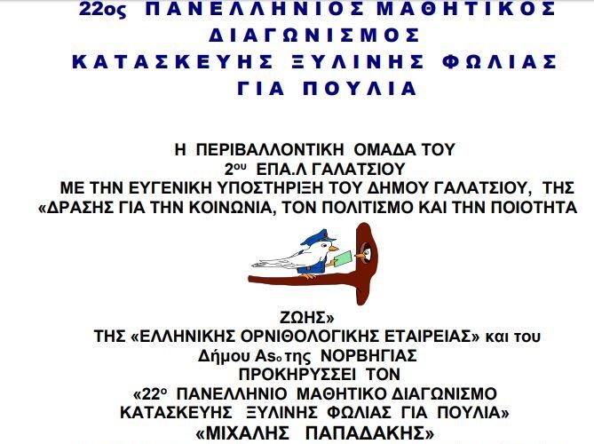 Η περιβαλλοντική ομάδα του 2ου ΕΠΑ.Λ Γαλατσίου καλεί όλους τους μαθητές (Νηπιαγωγείων, Δημοτικών, Γυμνασίων, ΓΕ.Λ., ΕΠΑ.Λ., Σ.Δ.Ε., Ε.Ε.Ε.Ε.Κ) να συμμετάσχουν στον «22ο Πανελλήνιο Μαθητικό Διαγωνισμό Κατασκευής Ξύλινης Φωλιάς για Πουλιά» και να δείξουν έμπρακτα την αγάπη τους για τα πουλιά.