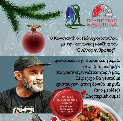 Στο χριστουγεννιάτικο χωριό του Δήμου Γαλατσίου (Παπαφλέσσα, Φαύνου & Κυμοθόης) την Παρασκευή 24 Δεκεμβρίου (12:00 – 14:00), ο Κωνσταντίνος Πολυχρονόπουλος με την κοινωνική κουζίνα του “Ο Άλλος Άνθρωπος” μαγειρεύει και προσφέρει, ΔΩΡΕΑΝ, σε όλους κοκκινιστή χριστουγεννιάτικη όρνιθα με ρύζι (250 μερίδες).
