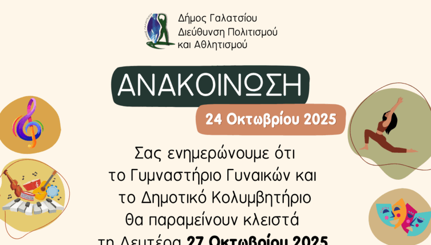 Σας ενημερώνουμε ότι τη Δευτέρα 27 Οκτωβρίου το Γυμναστήριο Γυναικών και το Δημοτικό Κολυμβητήριο θα παραμείνουν κλειστά, λόγω απασχόλησης των γυμναστών στις προετοιμασίες για τις εκδηλώσεις εορτασμού της 28ης Οκτωβρίου.