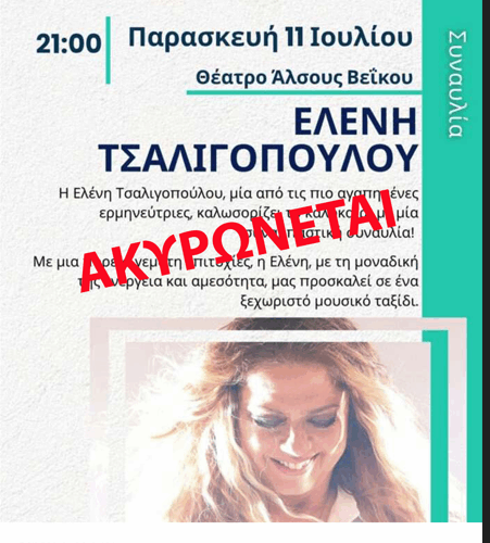 Σας ενημερώνουμε πως για λόγους υγείας, η Ελένη Τσαλιγοπούλου δεν θα πραγματοποιήσει τις προγραμματισμένες καλοκαιρινές εμφανίσεις της έως και τις 20/7. Ευχόμαστε ταχεία ανάρρωση στην αγαπημένη ερμηνεύτρια και περιμένουμε να την απολαύσουμε ξανά στους συναυλιακούς χώρους της Ελλάδας το υπόλοιπο καλοκαίρι.