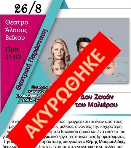 Σας ενημερώνουμε ότι ΑΚΥΡΩΘΗΚΕ από την εταιρία παραγωγής η θεατρική παράσταση «Δον Ζουάν» του Μολιέρου, η οποία είχε προγραμματιστεί για τη Δευτέρα 26 Αυγούστου 2019, στο ανοιχτό Θέατρο Άλσους Βεΐκου, στο πλαίσιο του Καλοκαιρινού Φεστιβάλ Δήμου Γαλατσίου.
