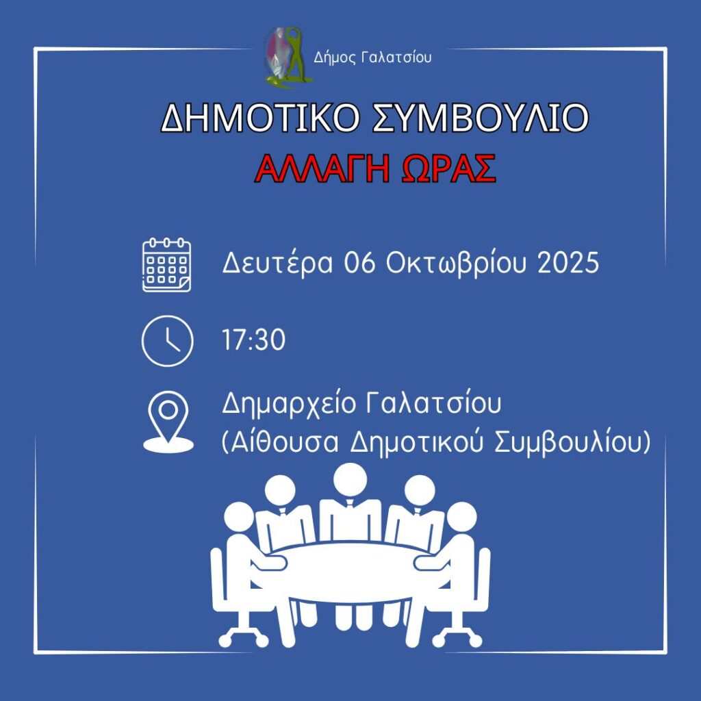 Σας ενημερώνουμε ότι η προγραμματισθείσα για τις 06.10.2025 Συνεδρίαση του Δημοτικού Συμβουλίου θα πραγματοποιηθεί, λόγω ειδικών συνθηκών, αντί στις 19:00 που είχε ορισθεί με την υπ’ αριθμ. πρωτ. 37141/02.10.2025 Πρόσκληση, στις 17:30.