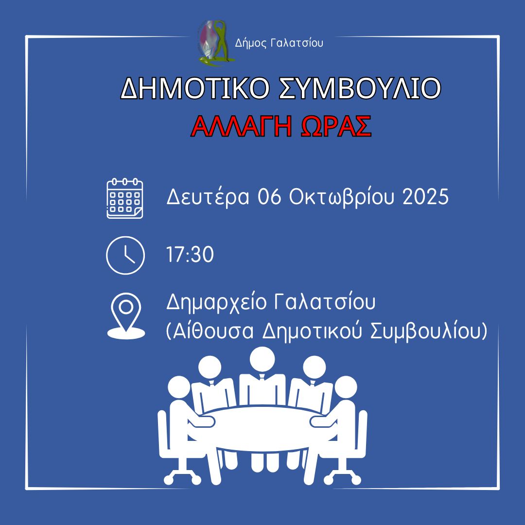 Σας ενημερώνουμε ότι η προγραμματισθείσα για τις 06.10.2025 Συνεδρίαση του Δημοτικού Συμβουλίου θα πραγματοποιηθεί, λόγω ειδικών συνθηκών, αντί στις 19:00 που είχε ορισθεί με την υπ’ αριθμ. πρωτ. 37141/02.10.2025 Πρόσκληση, στις 17:30.