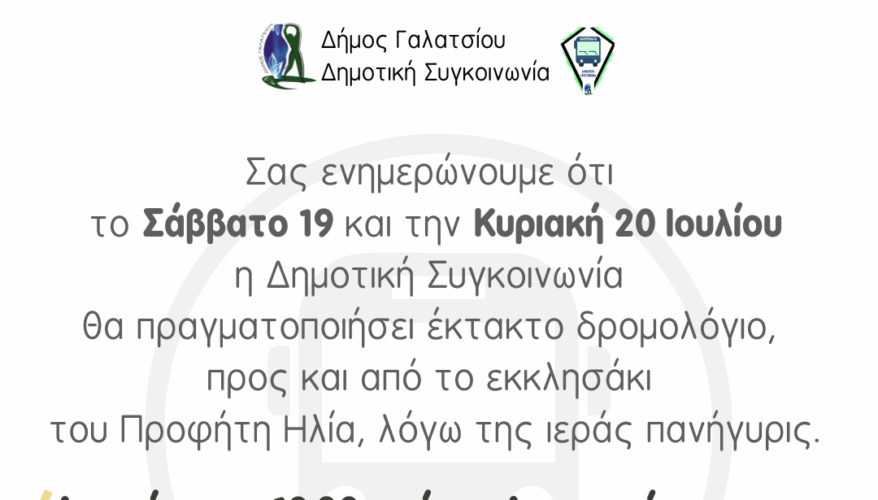 Ο Δήμος Γαλατσίου ενημερώνει τους πολίτες ότι, στο πλαίσιο της εορτής του Προφήτη Ηλία, το Σάββατο 19 και την Κυριακή 20 Ιουλίου 2025, θα πραγματοποιηθεί ειδικό δρομολόγιο της Δημοτικής Συγκοινωνίας, προκειμένου να διευκολυνθεί η πρόσβαση των πολιτών στον Ι.Ν. Προφήτη Ηλία.