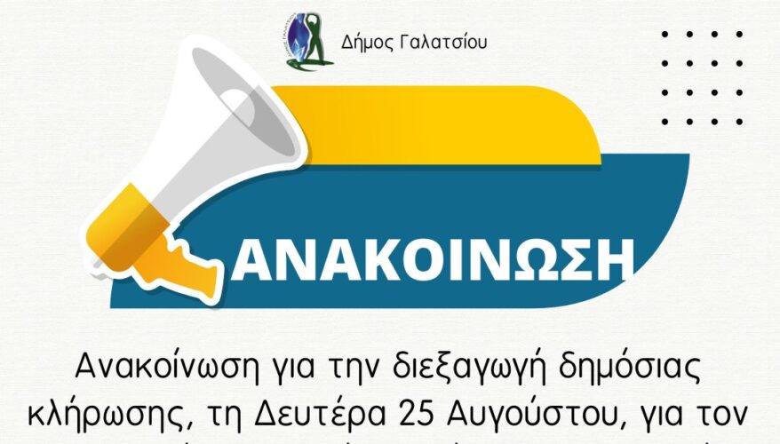 Θέμα: «Ανακοίνωση για την διεξαγωγή δημόσιας κλήρωσης, για τον καθορισμό της σειράς κατάταξης, υποψηφίων της 26605/09.07.2025 ανακοίνωσης του Δήμου Γαλατσίου, για την πρόσληψη ΥΕ σχολικών καθαριστών/τριών».