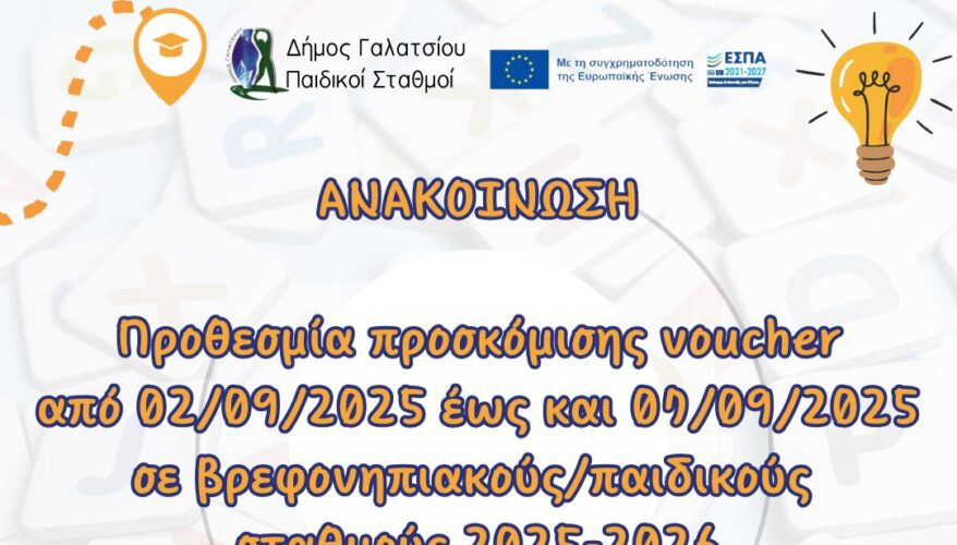 Η Διεύθυνση Κοινωνικής Προστασίας και Αλληλεγγύης Δήμου Γαλατσίου ενημερώνει τους γονείς των βρεφών και νηπίων που επιθυμούν να φιλοξενηθούν στους Δημοτικούς Παιδικούς και Βρεφονηπιακούς μας Σταθμούς, μέσω της Δράσης «Προώθηση και υποστήριξη παιδιών για την ένταξή τους στην προσχολική εκπαίδευση καθώς και για τη πρόσβαση παιδιών σχολικής ηλικίας, εφήβων και ατόμων με αναπηρία, σε υπηρεσίες δημιουργικής απασχόλησης» της ΕΕΤΑΑ ΑΕ., περιόδου 2025-2026 πως και φέτος για λόγους διευκόλυνσης των γονέων, η προσκόμιση της αξίας τοποθέτησης (voucher) θα γίνει μόνο ηλεκτρονικά στη διεύθυνση dps@galatsi.gr.