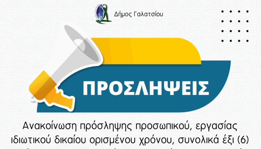 Την πρόσληψη, με σύμβαση εργασίας ιδιωτικού δικαίου ορισμένου χρόνου, συνολικά έξι (6) ατόμων για την υλοποίηση της Πράξης «Λειτουργία Διευρυμένου Κέντρου Κοινότητας (Κεντρική δομή & Παράρτημα ΚΕΜ) Δήμου Γαλατσίου» με κωδικό ΟΠΣ (MIS) 6002404 στο Επιχειρησιακό Πρόγραμμα «Αττική 2021-2027», στον Δήμο Γαλατσίου, που εδρεύει στο Γαλάτσι της Περιφερειακής Ενότητας Κεντρικού Τομέα Αθηνών, και συγκεκριμένα του εξής, ανά υπηρεσία, έδρα, κλάδο/ ειδικότητα και διάρκεια σύμβασης, αριθμού ατόμων (βλ. ΠΙΝΑΚΑ Α), με τα αντίστοιχα απαιτούμενα (τυπικά και τυχόν πρόσθετα) προσόντα (βλ. ΠΙΝΑΚΑ Β):