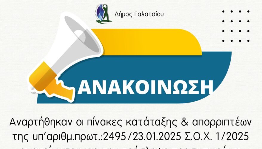 Αναρτήθηκαν σήμερα 11 Σεπτεμβρίου 2025 οι πίνακες κατάταξης & απορριπτέων της υπ’αριθμ.πρωτ.:2495/23.01.2025 Σ.Ο.Χ. 1/2025 ανακοίνωσης για την πρόσληψη προσωπικού με σύμβαση εργασίας ορισμένου χρόνου συνολικά έξι (6) ατόμων για την υλοποίηση της Πράξης «Λειτουργία Διευρυμένου Κέντρου Κοινότητας (Κεντρική δομή & Παράρτημα ΚΕΜ) Δήμου Γαλατσίου»