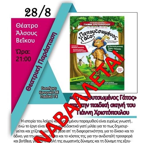 Ο Δήμος Γαλατσίου ενημερώνει ότι αναβάλλεται η παιδική θεατρική παράσταση «Ο Παπουτσωμένος Γάτος» από την παιδική σκηνή του Γιάννη Χριστόπουλου, που ήταν προγραμματισμένη για την Τετάρτη 28 Αυγούστου, στο Ανοιχτό Θέατρο Άλσους Βεϊκου, στο πλαίσιο του Φεστιβάλ Γαλατσίου 2019. Η παιδική παράσταση θα παρουσιαστεί την Παρασκευή 20 Σεπτεμβρίου 2019, στις 20:30, στο Ανοιχτό Θέατρο Άλσους Βεϊκου.