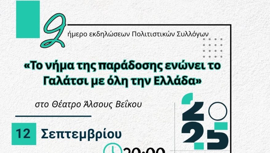 Η εκδήλωση των Πολιτιστικών Συλλόγων, «Το νήμα της παράδοσης ενώνει το Γαλάτσι με όλη την Ελλάδα», στο πλαίσιο του Καλοκαιρινού Φεστιβάλ Γαλατσίου 2025, που ήταν προγραμματισμένη για σήμερα Παρασκευή 12 Σεπτεμβρίου, ΑΝΑΒΑΛΛΕΤΑΙ και θα πραγματοποιηθεί τη Δευτέρα 15 Σεπτεμβρίου 2025, στις 20:00, στο Ανοιχτό Θέατρο Άλσους Βεΐκου, στις