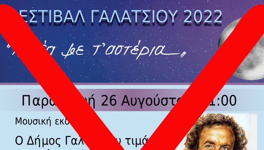 Ο Δήμος Γαλατσίου σας ενημερώνει ότι αναβάλλονται, λόγω έκτακτων έντονων καιρικών φαινομένων και οι εκδηλώσεις του Παιδικού και του Θερινού Φεστιβάλ που είχαν προγραμματιστεί για την Παρασκευή 26 Αυγούστου 2022.