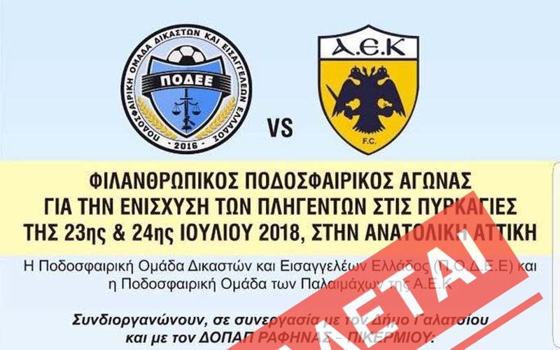 Λόγω των ακραίων καιρικών φαινομένων, ο φιλανθρωπικός ποδοσφαιρικός αγώνας μεταξύ της ποδοσφαιρικής ομάδος Δικαστών & Εισαγγελέων Ελλάδος (ΠΟΔΕΕ) και της αντίστοιχης ομάδας των παλαιμάχων της ΑΕΚ, που επρόκειτο να διεξαχθεί σήμερα 25 Ιανουαρίου 2019 και ώρα 19:00 αναβάλλεται, λόγω δυσμενών καιρικών συνθηκών.