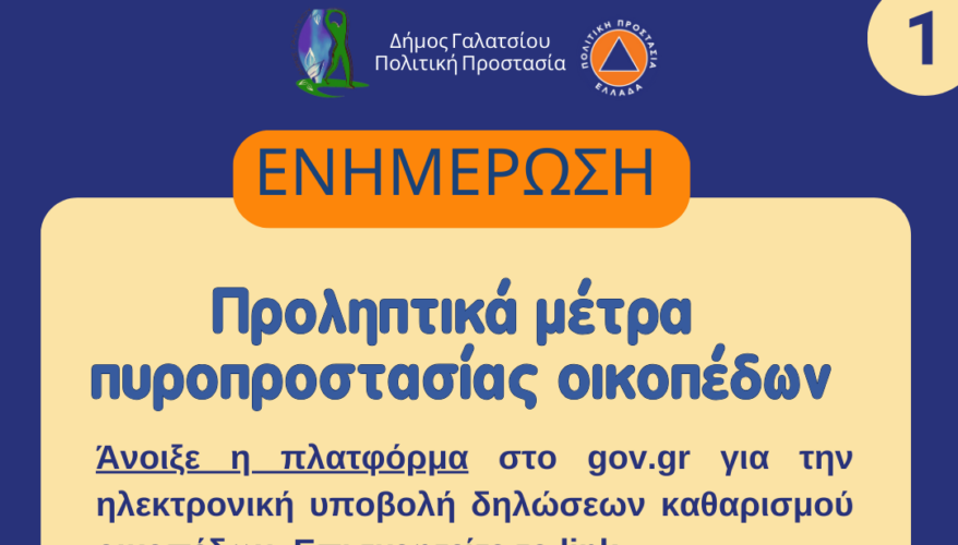 Σας ενημερώνουμε ότι η ψηφιακή πλατφόρμα για τις ηλεκτρονικές δηλώσεις καθαρισμού οικοπέδων, σύμφωνα με την 20/2024 Πυροσβεστική Διάταξη, είναι πλέον διαθέσιμη, μέσω της ιστοσελίδας https://akatharista.apps.gov.gr