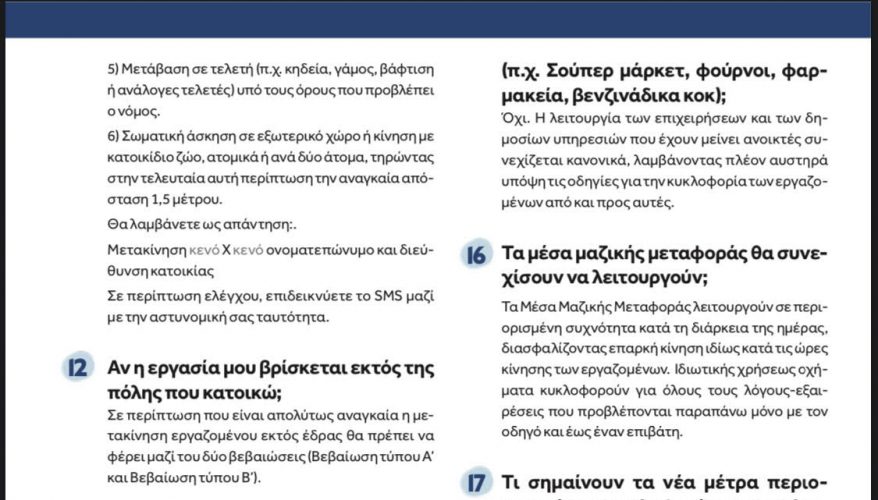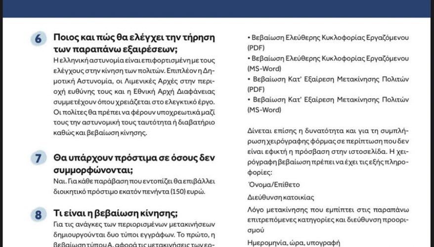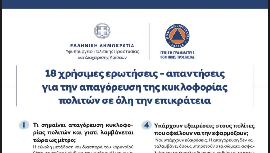 Όπως εξήγγειλε ο Πρωθυπουργός, από αύριο ισχύουν ακόμα πιο αυστηρά μέτρα περιορισμού της κυκλοφορίας. Κάθε μετακίνηση που δεν είναι πραγματικά αναγκαία, απαγορεύεται. Μέτρο σκληρό αλλά απολύτως αναγκαίο. Στις ερωτήσεις και απαντήσεις που ανεβάζουμε, μπορείτε να βρείτε όλες τις αναγκαίες πληροφορίες.