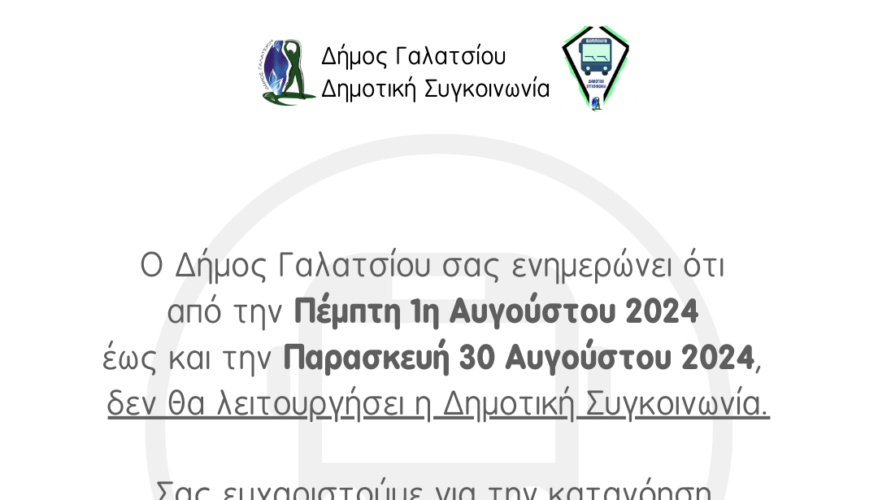 Ο Δήμος Γαλατσίου σας ενημερώνει ότι από την Πέμπτη 1η Αυγούστου 2024 έως και την Παρασκευή 30 Αυγούστου 20243, δεν θα λειτουργήσει η Δημοτική Συγκοινωνία.