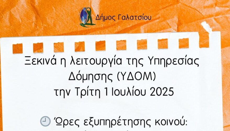 Σας ενημερώνουμε ότι από την Τρίτη 1 Ιουλίου 2025, ξεκινά επίσημα τη λειτουργία της η Υπηρεσία Δόμησης (ΥΔΟΜ) του Δήμου Γαλατσίου.
