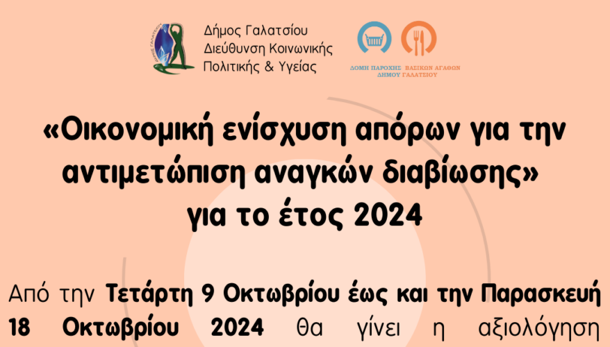 Από σήμερα Τετάρτη 9 Οκτωβρίου 2024 η κατάθεση δικαιολογητικών για το πρόγραμμα «Οικονομική ενίσχυση απόρων για την αντιμετώπιση αναγκών διαβίωσης»