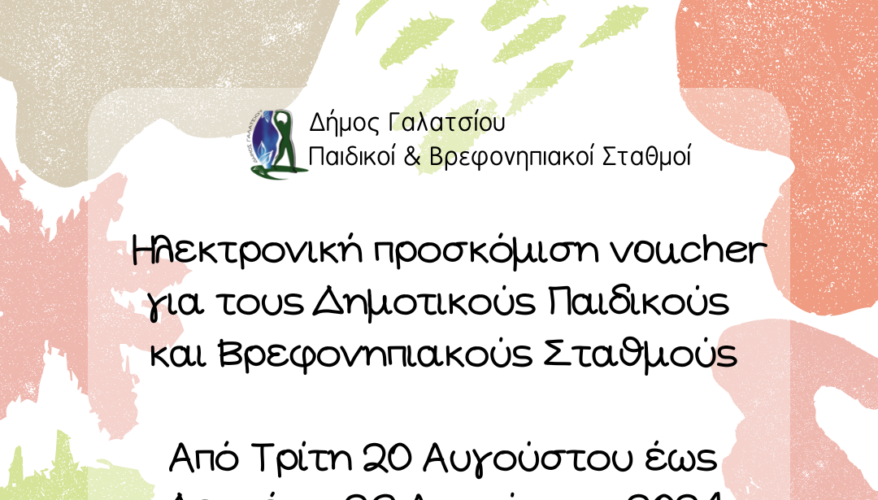 Η Διεύθυνση Κοινωνικής Προστασίας και Αλληλεγγύης Δήμου Γαλατσίου ενημερώνει τους γονείς των βρεφών και νηπίων που επιθυμούν να φιλοξενηθούν στους Δημοτικούς Παιδικούς και Βρεφονηπιακούς μας Σταθμούς, μέσω της Δράσης «Προώθηση και υποστήριξη παιδιών για την ένταξή τους στην προσχολική εκπαίδευση καθώς και για τη πρόσβαση παιδιών σχολικής ηλικίας, εφήβων και ατόμων με αναπηρία, σε υπηρεσίες δημιουργικής απασχόλησης» της ΕΕΤΑΑ ΑΕ., περιόδου 2024-2025 πως και φέτος για λόγους διευκόλυνσης των γονέων, η προσκόμιση της αξίας τοποθέτησης (voucher) θα γίνει μόνο ηλεκτρονικά στην διεύθυνση dps@galatsi.gr .