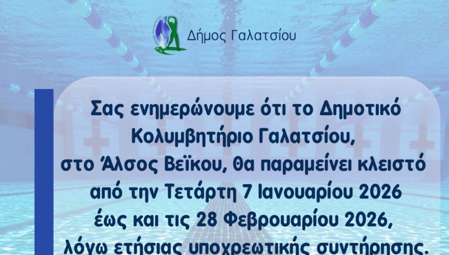 Σας ενημερώνουμε ότι το Δημοτικό Κολυμβητήριο Γαλατσίου, στο Άλσος Βεΐκου, θα παραμείνει κλειστό από την Τετάρτη 7 Ιανουαρίου 2026 έως και τις 28 Φεβρουαρίου 2026, λόγω της ετήσιας υποχρεωτικής συντήρησης των εγκαταστάσεων.