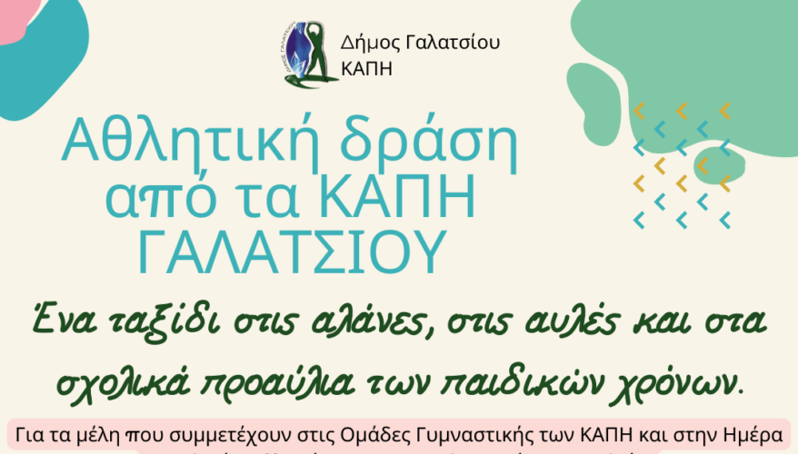 Τα ΚΑΠΗ ΓΑΛΑΤΣΙΟΥ διοργανώνουν αθλητική δράση την Πέμπτη 23 Μαΐου 2024, στις 09:30, στον κλειστό χώρο του μπάσκετ στο Άλσος Βεΐκου.