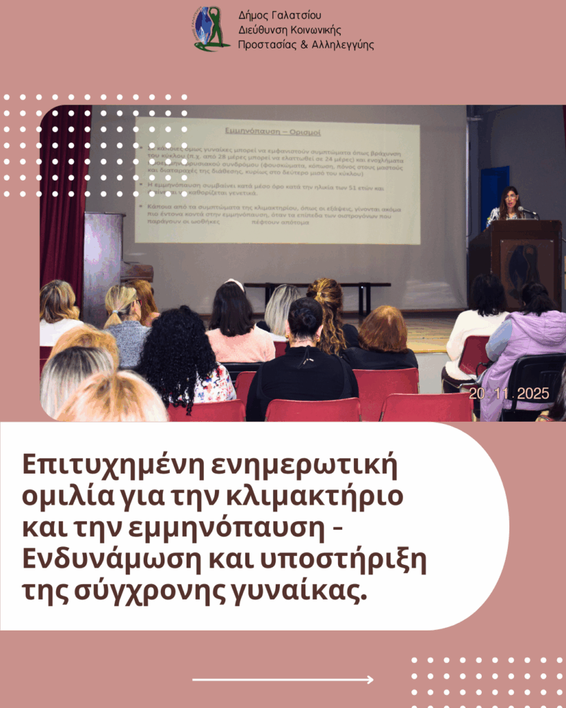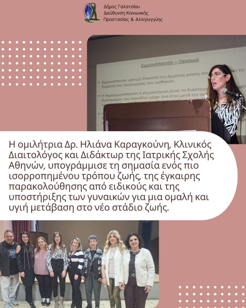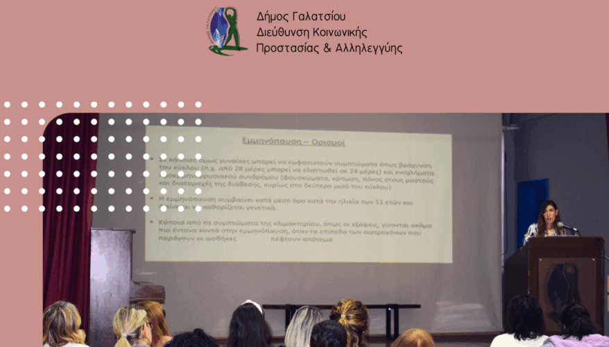Ο Δήμος Γαλατσίου, στο πλαίσιο των δράσεων πρόληψης και προαγωγής της υγείας, πραγματοποίησε με ιδιαίτερη επιτυχία ενημερωτική ομιλία με θέμα «Ενημέρωση και ενδυνάμωση της γυναίκας στην κλιμακτήριο – εμμηνόπαυση», με ομιλήτρια την κα Δρ. Ηλιάνα Καραγκούνη Κλινική Διαιτολόγο, Διδάκτορα Ιατρικής Σχολής Αθηνών και Επιστημονική Συνεργάτιδα του Αρεταίειου Νοσοκομείου.