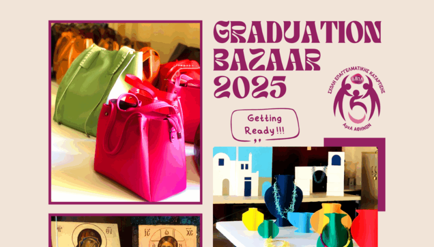 Την Παρασκευή 13 Ιουνίου 2025, στις 19:00, παράλληλα με την τελετή αποφοίτησης της Σχολής ΑμεΑ θα πραγματοποιηθεί Bazaar με χειροποίητες δημιουργίες, αποτέλεσμα δουλειάς, φαντασίας και δεξιοτήτων που αναπτύχθηκαν στη διάρκεια της φοίτησης.