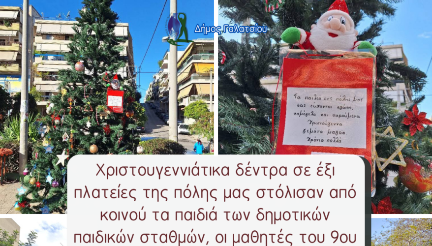 Με γιορτινή διάθεση και χαμόγελα τα παιδιά των δημοτικών παιδικών σταθμών Γαλατσίου, οι μαθητές του 9ου και 16ου Δημοτικού Σχολείου και τα μέλη του Β΄ ΚΑΠΗ στόλισαν χριστουγεννιάτικα δέντρα σε έξι πλατείες της πόλης.