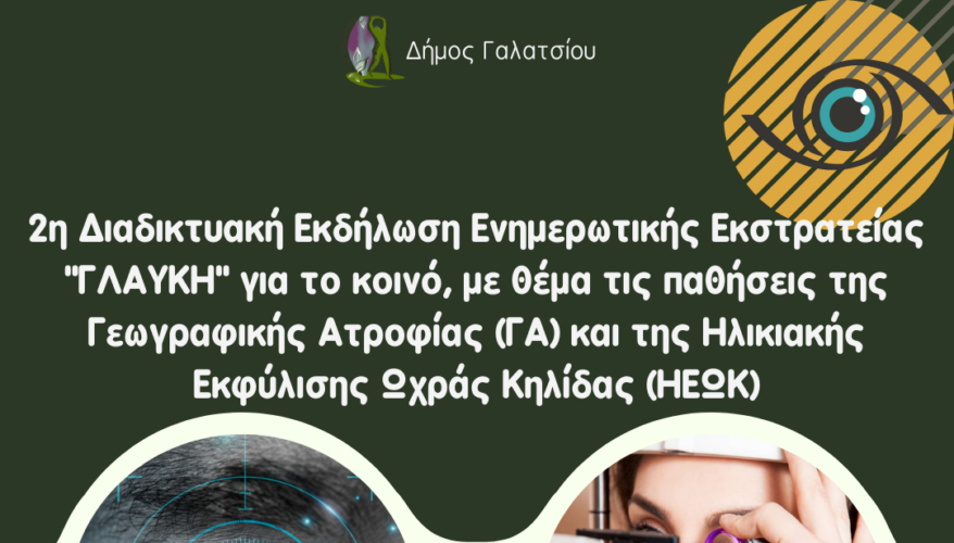 Ο Δήμος Γαλατσίου, ως μέλος του Ελληνικού Διαδημοτικού Δικτύου Υγειών Πόλεων – Προαγωγής Υγείας (ΕΔΔΥΠΠΥ), σας προσκαλεί να παρακολουθήσετε μέσω της πλατφόρμας zoom, τη Δεύτερη Διαδικτυακή Εκδήλωση Ευαισθητοποίησης & Ενημέρωσης Κοινού για τις παθήσεις της Γεωγραφικής Ατροφίας (ΓΑ) και της Ηλικιακής Εκφύλισης Ωχράς Κηλίδας (ΗΕΩΚ), που θα πραγματοποιηθεί την Τρίτη 11 Φεβρουαρίου 2025 και ώρα 18:30 – 21:00 στην Κεντρική Μακεδονία, στο πλαίσιο της προστασίας και της προαγωγής της υγείας των πολιτών.