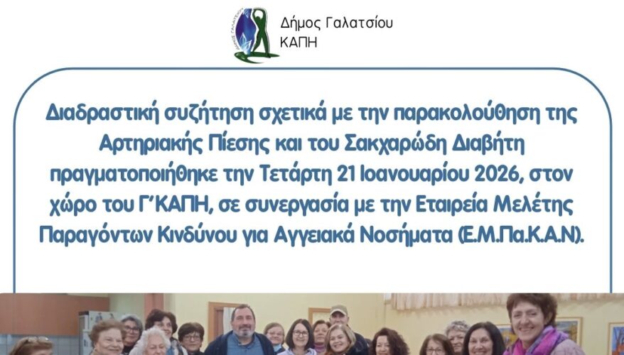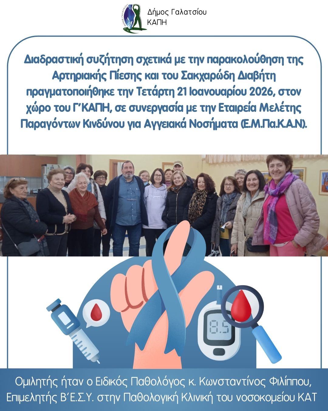 Διαδραστική συζήτηση για τις καθημερινές απορίες των ηλικιωμένων σχετικά με την παρακολούθηση της Αρτηριακής Πίεσης και του Σακχαρώδη Διαβήτη πραγματοποιήθηκε την Τετάρτη 21 Ιοανουαρίου 2026, στον χώρο του Γ΄ΚΑΠΗ, με ομιλητή τον Ειδικό Παθολόγο κ. Κωνσταντίνο Φιλίππου, Επιμελητής Β΄Ε.Σ.Υ. στην Παθολογική Κλινική του νοσοκομείου ΚΑΤ, σε συνεργασία με την Εταιρεία Μελέτης Παραγόντων Κινδύνου για Αγγειακά Νοσήματα (Ε.Μ.Πα.Κ.Α.Ν).