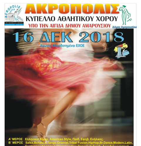 Συγκεκριμένα την Κυριακή 16 Δεκεμβρίου 2018 συμμετέχουν στον διαγωνισμό μοντέρνου χορού «ΑΚΡΟΠΟΛΙΣ», ο οποίος διοργανώνεται υπό την αιγίδα του Δήμου Αμαρουσίου, στο Κλειστό Δημοτικό Γυμναστήριο «Αγ.Θωμά», για να διεκδικήσουν το κύπελλο αθλητικού χορού.