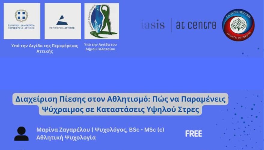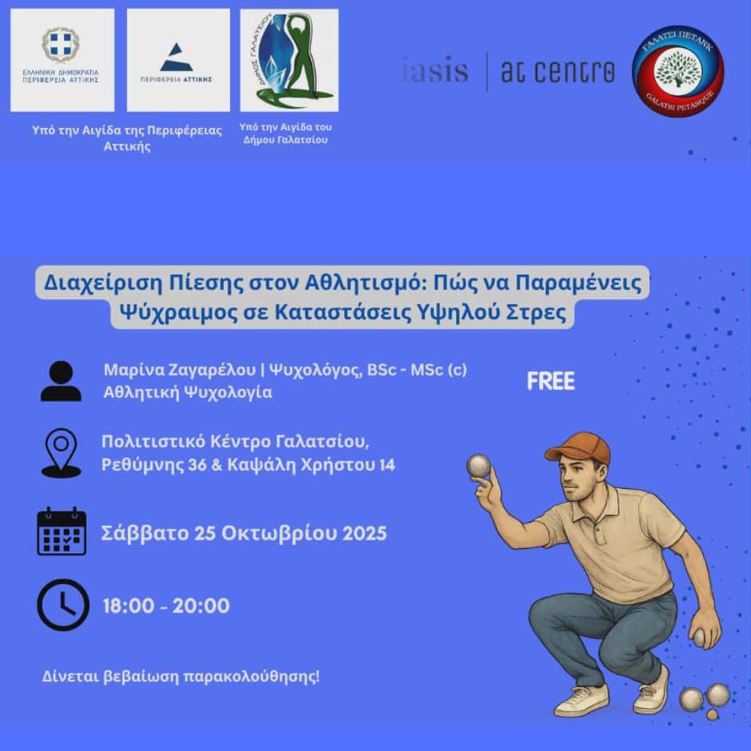 «Διαχείριση Πίεσης στον Αθλητισμό: Πώς να παραμένεις ψύχραιμος σε κατάσταση υψηλού στρες», ένα ακόμα στοχευμένο σεμινάριο που εστιάζει στις αιτίες και τους τρόπους αντιμετώπισης του άγχους στον αθλητισμό, από το Σωματείο Galatsi petanque , σε συνεργασία με το IASIS | At Centro.