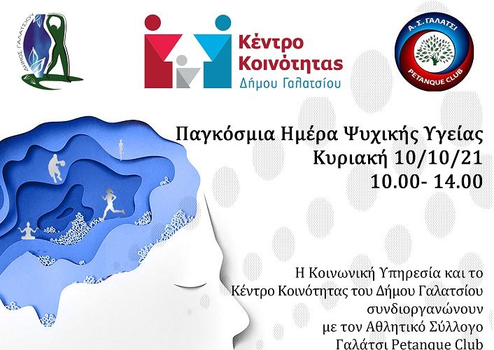 Με αφορμή την Παγκόσμια Ημέρα Ψυχικής Υγείας, το Κέντρο Κοινότητας του Δήμου Γαλατσίου και το Τμήμα Ψυχοκοινωνικής Στήριξης της Διεύθυνσης Κοινωνικής Πολιτικής και Υγείας διοργανώνουν δράση την Κυριακή 10/10/2021 στο Άλσος Βεΐκου και ώρες 10π.μ. – 2μ.μ., με στόχο την ευαισθητοποίηση του κοινού σε θέματα ψυχικής υγείας.