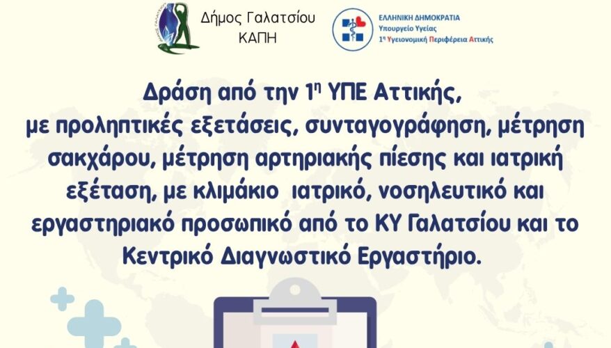 Η 1η ΥΠΕ Αττικής, κατόπιν οδηγίας του Υπουργού Υγείας κ. Άδωνι Γεωργιάδη και με τη συμβολή του Δημάρχου Γαλατσίου κ. Γεώργιου Μαρκόπουλου, την Παρασκευή 3/4/2026 και ώρα 09:00 π.μ., στο Α΄ ΚΑΠΗ του Δήμου Γαλατσίου (Ορφέως 20), θα πραγματοποιήσει δράση στο πλαίσιο υλοποίησης προγράμματος πρόληψης χρόνιων νοσημάτων, η οποία περιλαμβάνει: