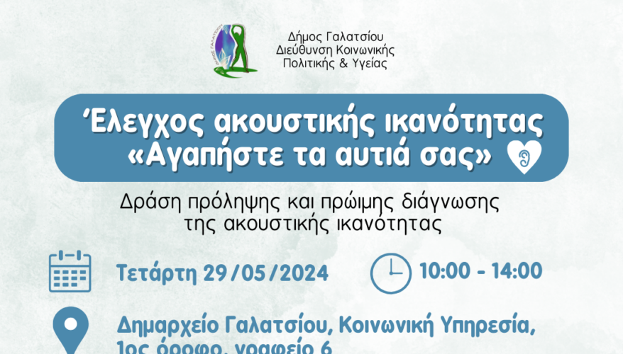 Δράση πρόληψης και πρώιμης διάγνωσης της ακουστικής ικανότητας με τίτλο: «Αγαπήστε τα αυτιά σας», θα πραγματοποιηθεί στο Δημαρχείο Γαλατσίου, στην Κοινωνική Υπηρεσία, στον 1ο όροφο, γραφείο 6, την Τετάρτη 29/05/2024 και ώρες 10:00 – 14:00 κατόπιν ραντεβού.
