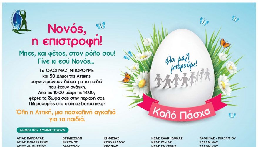 Ο Δήμος Γαλατσίου & το Κοινωνικό Παντοπωλείο, σε συνεργασία με το «Όλοι Μαζί Μπορούμε», διοργανώνει δράση με στόχο τη συγκέντρωση πασχαλινών δώρων (όπως λαμπάδες, παιχνίδια, παπούτσια και ό,τι άλλο μπορεί να ονειρευτεί ένα παιδί), για τα παιδιά των οικογενειών του Δήμου Γαλατσίου, που ανήκουν στις ευπαθείς κοινωνικές ομάδες.