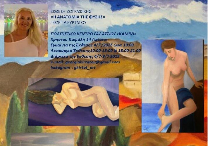 Την Παρασκευή 4 Ιουλίου 2025 τα εγκαίνια της ατομικής έκθεσης ζωγραφικής της Γεωργίας Κυρτάτου, με τίτλο “Η Ανατομία της Φύσης”, στο Πολιτιστικό Κέντρο “Καμίνι” Δήμου Γαλατσίου, στις 19:00.