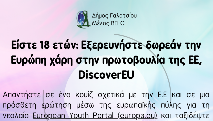 Ο Δήμος Γαλατσίου, ως μέλος του δικτύου BELC, σας ενημερώνει ότι από την επόμενη άνοιξη, χιλιάδες 18χρονοι θα έχουν την ευκαιρία να εξερευνήσουν δωρεάν την Ευρώπη, χάρη στην πρωτοβουλία DiscoverEU.