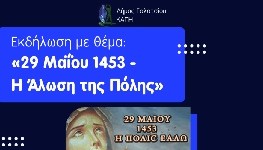 Την Τετάρτη 28 Μαΐου 2025, στις 11:00, στο Β΄ΚΑΠΗ Γαλατσίου (Πυθαγόρα 7), θα πραγματοποιηθεί πολιτιστική εκδήλωση των μελών με θέμα: «29 Μαΐου 1453 – Η Άλωση της Πόλης».