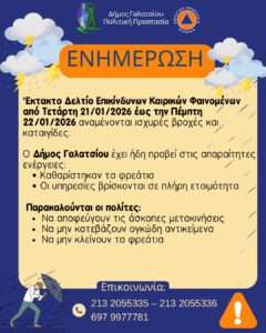 Το Αυτοτελές Τμήμα Πολιτικής Προστασίας Δήμου Γαλατσίου σας ενημερώνει ότι σύμφωνα με του έκτακτο δελτίο επικίνδυνων καιρικών φαινομένων από την ΕΜΥ/ΕΜΚ 20-01-2026/1130 B