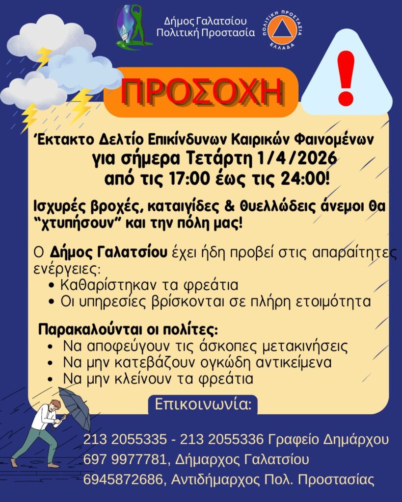 Έκτακτο Δελτίο Επικίνδυνων Καιρικών Φαινομένων για σήμερα Τετάρτη 1/4/2026 από τις 17:00 έως τις 24:00!