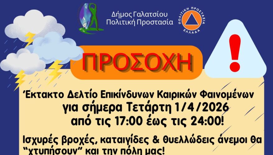 Έκτακτο Δελτίο Επικίνδυνων Καιρικών Φαινομένων για σήμερα Τετάρτη 1/4/2026 από τις 17:00 έως τις 24:00!