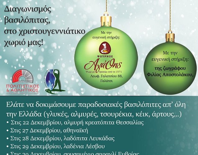 Ελάτε να δοκιμάσουμε παραδοσιακές βασιλόπιτες απ’ όλη την Ελλάδα (γλυκές, αλμυρές, τσουρέκια, κέικ, άρτους…) στο χριστουγεννιάτικο χωριό μας!