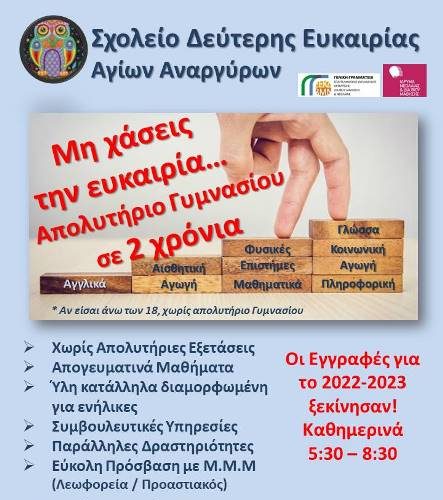 Όσοι ενδιαφέρονται να υποβάλουν αίτηση για την εγγραφή τους στον Α΄ Κύκλο Σπουδών και να ολοκληρώσουν την υποχρεωτική εκπαίδευση, αποκτώντας Απολυτήριο Γυμνασίου σε δύο έτη, μπορούν να προσέρχονται στα γραφεία του ΣΔΕ (Πίνδου Δαβάκη 20, Άγιοι Ανάργυροι) καθημερινά 5:00-8:00 μ.μ. μέχρι τις 30 Σεπτέμβρη.