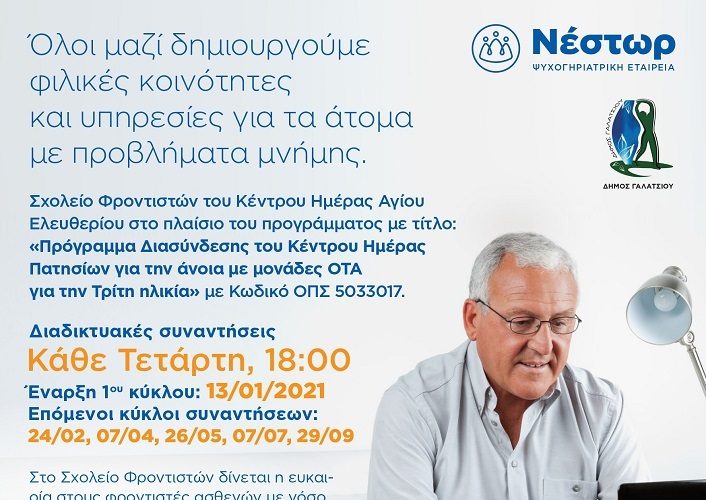 Παρακολουθήστε το πρόγραμμα για το σχολείο Φροντιστών με τη νόσο Alzheimer που ξεκινά σήμερα Τετάρτη 13 Ιανουαρίου 2021, ώρες 6.00 με 7.30 μμ.. Η παρακολούθηση πραγματοποιείται διαδικτυακά μέσω της εφαρμογής zoom.