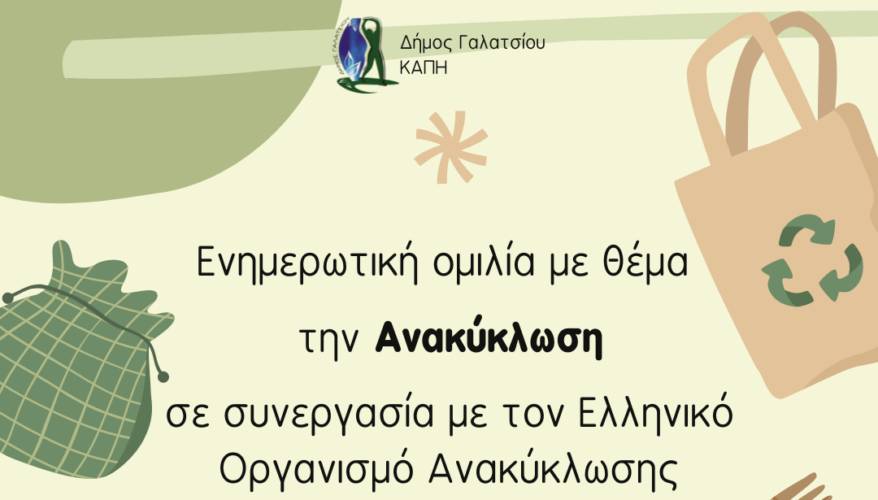 Eνημερωτική ομιλία με θέμα την Ανακύκλωση θα πραγματοποιηθεί τη ΔΕΥΤΕΡΑ 30 ΣΕΠΤΕΜΒΡΙΟΥ, στις 11:00, στον χώρο του Β΄ΚΑΠΗ (Πυθαγόρα 7), από τα ΚΑΠΗ Γαλατσίου σε συνεργασία με τον Ελληνικό Οργανισμό Ανακύκλωσης.