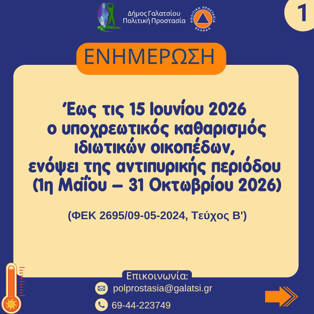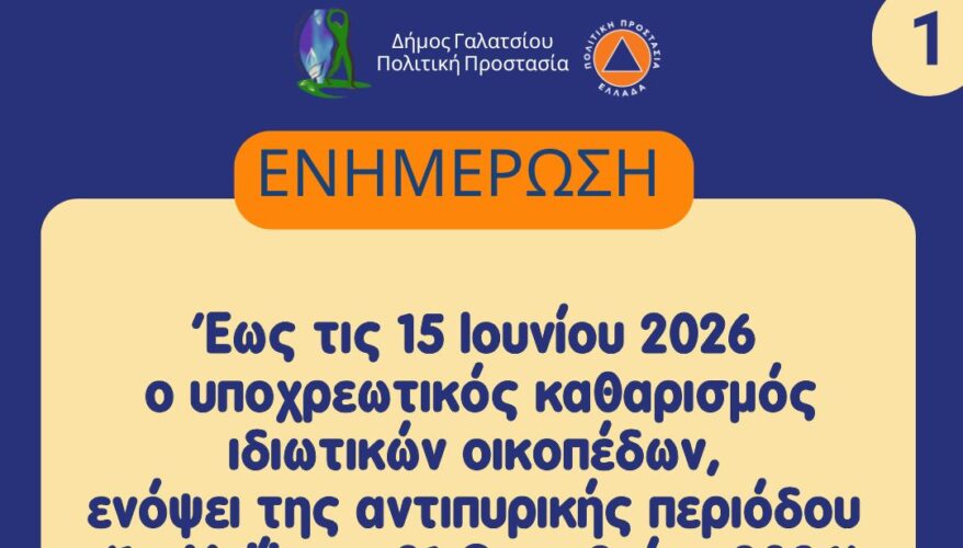 Ο Δήμος Γαλατσίου ενημερώνει τους ιδιοκτήτες, νομείς και επικαρπωτές οικοπέδων και ακάλυπτων χώρων – τόσο εντός όσο και εκτός ρυμοτομικού σχεδίου πόλης – για την υποχρέωσή τους να προβούν σε καθαρισμό των ιδιοκτησιών τους έως τις 15 Ιουνίου 2026, ενόψει της αντιπυρικής περιόδου (1η Μαΐου – 31 Οκτωβρίου 2026), προς αποφυγή κινδύνου πρόκλησης πυρκαγιάς από ξερά χόρτα και εύφλεκτα υλικά.