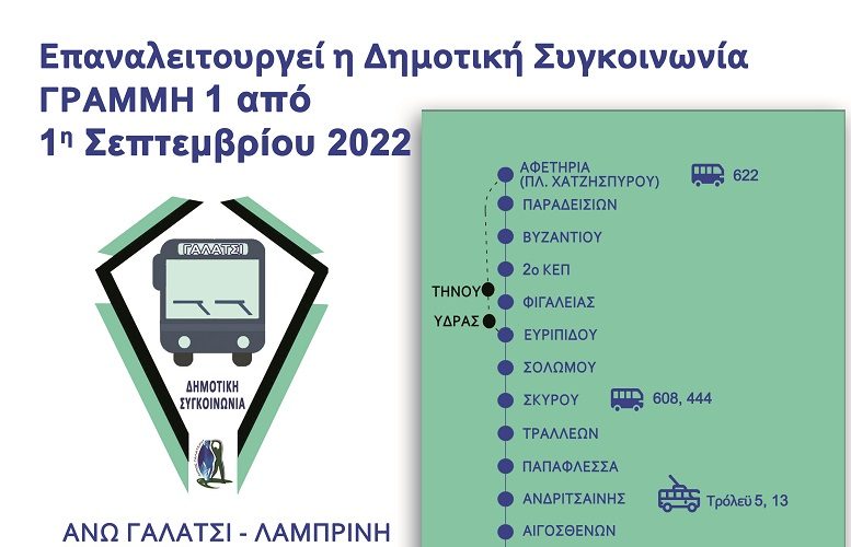 Ο Δήμος Γαλατσίου σας ενημερώνει ότι, από αύριο Πέμπτη 1η Σεπτεμβρίου 2022 επαναλειτουργεί η Δημοτική Συγκοινωνία Γραμμή 1