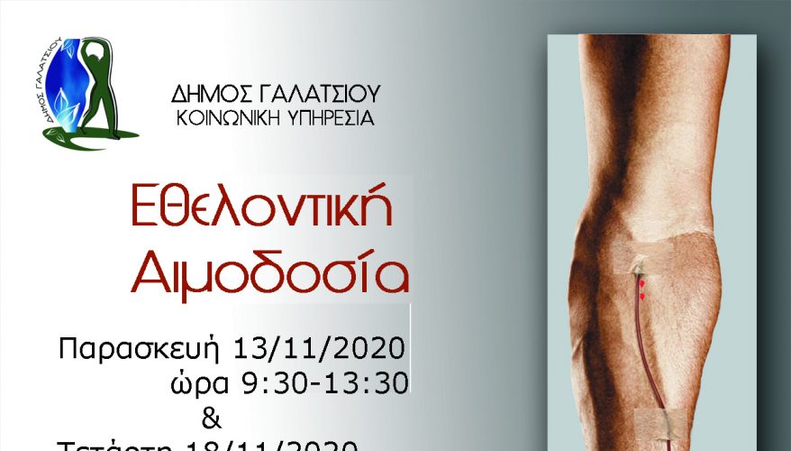 Εθελοντική Aιμοδοσία Δήμου Γαλατσίου στις 13 και στις 18 Νοεμβρίου 2020 και έκτακτη αιμοδοσία στις 26 Νοεμβρίου 2020
