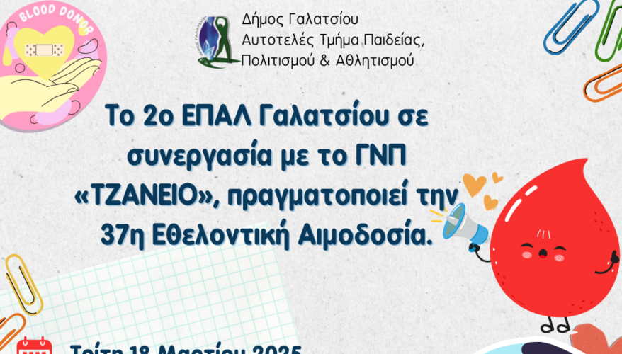 Την 37η Εθελοντική Αιμοδοσία, πραγματοποιεί το 2ο ΕΠΑΛ Γαλατσίου, σε συνεργασία με το ΓΝΠ «ΤΖΑΝΕΙΟ», την Τρίτη 18 Μαρτίου 2025 και ώρα 09:00-13:00, στον προαύλιο χώρο του σχολείου.